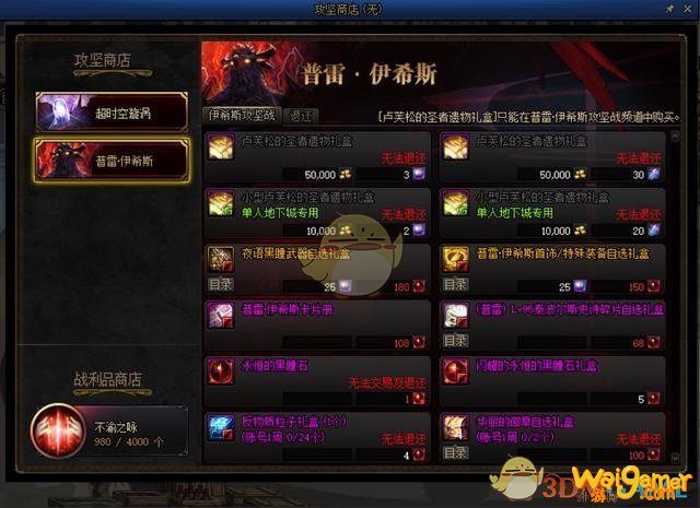 新增150个黑瞳石和25个精炼的时空石兑换的普雷权能装备自选礼盒,同样是帐号绑定的,不用说大家也知道了,小号现在直接变成普雷装备搬砖的了,到时候在刷每日2+2就能获得100级的史诗工作服,相对来说直接兑换便宜了太多了。