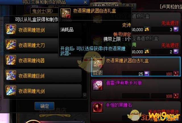 新增180个黑瞳石和25个精炼的时空石兑换一个夜雨黑瞳武器自选礼盒,并且还是帐号绑定的。